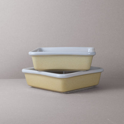 Size: 1.8L Volume, 7cm Height , 22.5cm Width , 22.5cm Depth (approx.). Due to the hand-finished nature of our stoneware products, some variance in colour and pattern is likely to occur.
